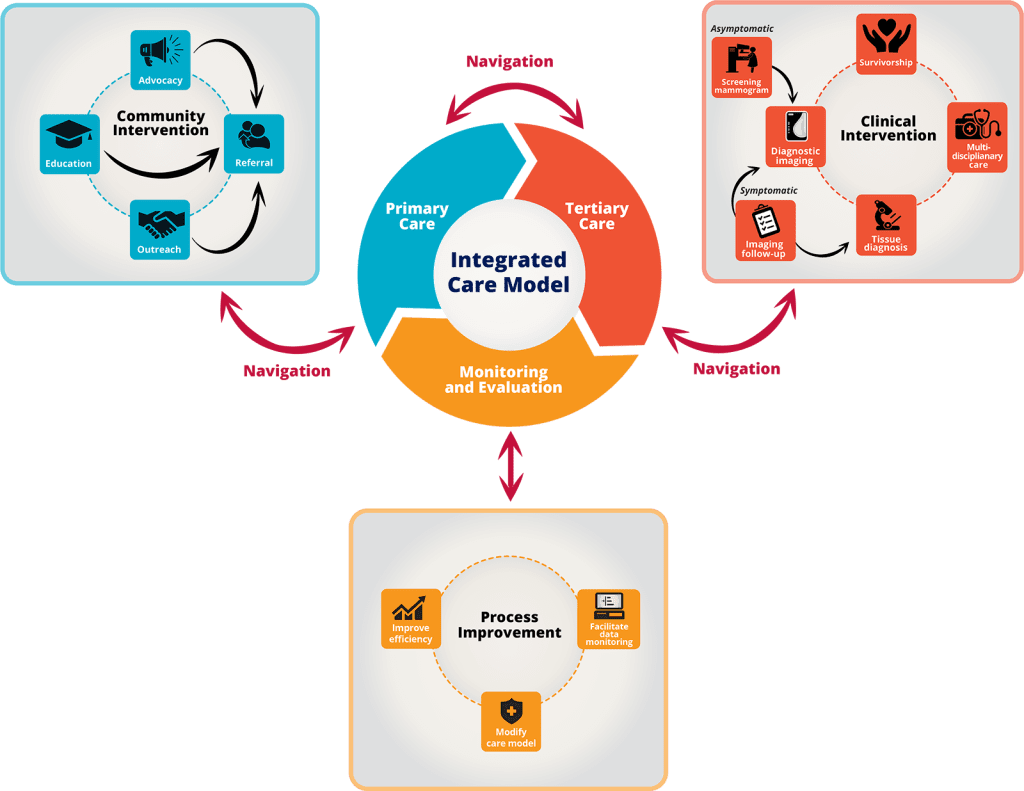 In the community, navigators educate the public and address barriers to help women access care at their primary care clinic. This includes scheduling screening, diagnosis and biopsy appointments, arranging travel, enrolling the underinsured in regional and federal insurance programs/charity care, sending reminders, and explaining care received.